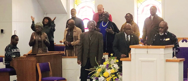 Pastor Williams and choir members at recent Thanksgiving program during congregational song.