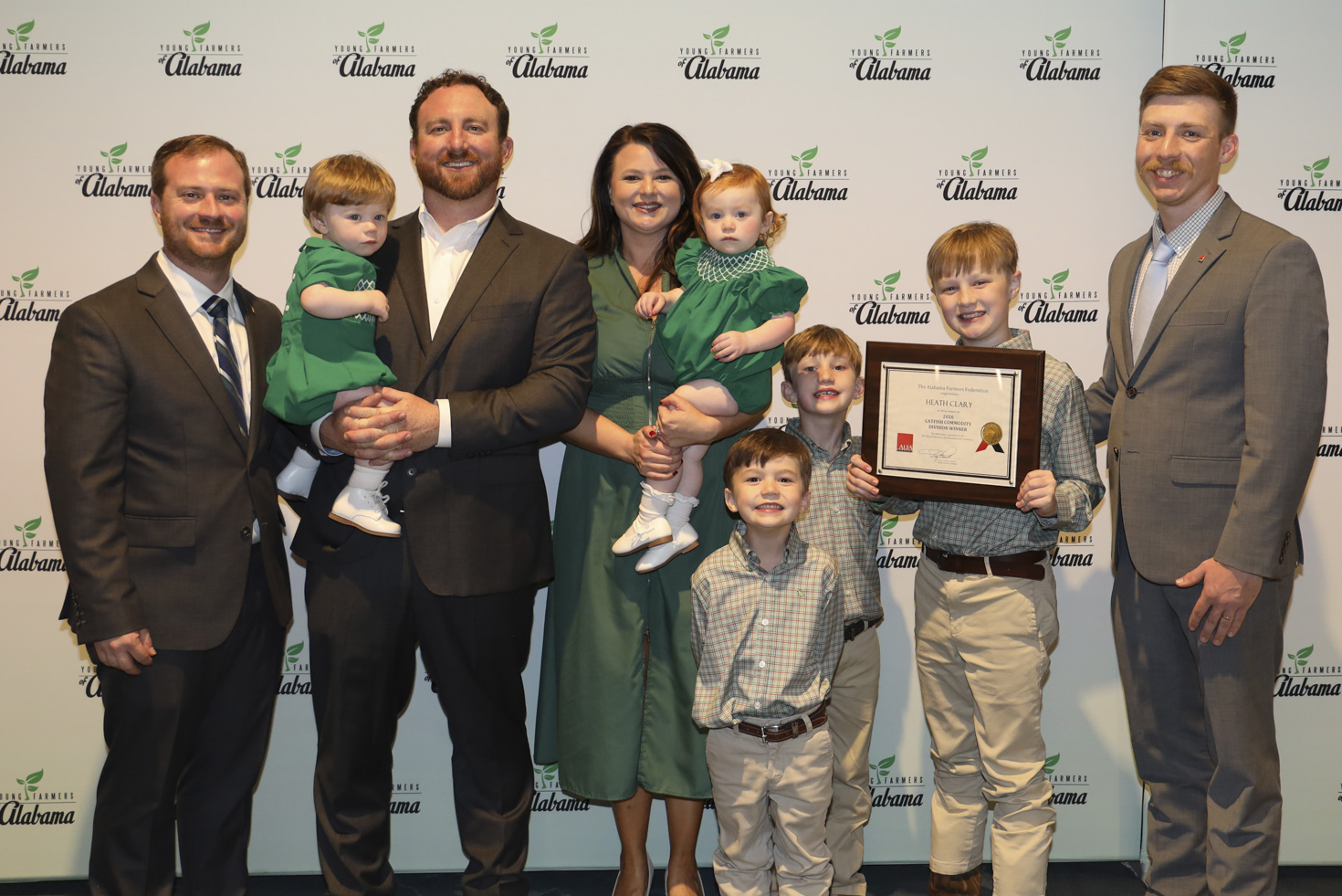 Heath Clary of Hale County was named the Catfish Division winner in the statewide Outstanding Young Farm Family (OYFF) contest organized by the Alabama Farmers Federation. Clary was recognized during the Federation’s Young Farmers Conference Feb. 28 in Gulf Shores in front of 450 of his peers. He farms in Newbern. As the Catfish Division winner, Clary will serve an ex-officio term on the Federation’s State Catfish Committee. He also received $500 from the Federation and a Turtlebox Original speaker courtesy of Alfa Insurance and Alfa Member Benefits. OYFF competitors are farmers ages 18 to 35 years old who earn most of their income from production agriculture and are judged based on farm growth, Federation involvement and community service. Clary won the division following an in-depth application and interview process. From left are Federation Young Farmers Division Director Hunter McBrayer; Clary, wife Christina and their children; and State Young Farmers Committee Chairman Forrest Anders.